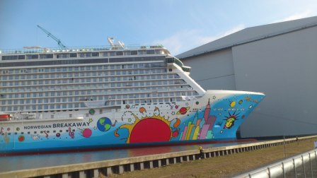 ...das jemals in Deutschland gebaut wurde, ist ausgedockt worden. Es handelt sich um ein Schiff der NCL (NorwegianCruiseLine) und heißt: Norwegian BREAKAWAY. An der Frobt ist ein Popartgemälde von Peter Max. Ich mußte mich erstmal "schlau'" lesen, da ich vor Ort sowas wie "Pelen Max. oder Polen Max." gelesen habe.