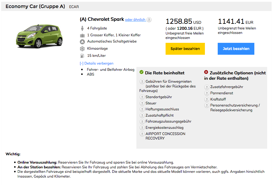 Vorausgegangen sind die angehängten Ergebnisse bei Hertz (ich weiß, über andere Länder und mit Code ist es günstiger, mir ging es jetzt aber erstmal um die Bedingungen). Dabei kostet ein Spark dank Einwegmiete deutlich mehr als ein Standard SUV, bei dem nichts von Einwegmiete steht. Die nette Dame am Telefon sagte, dass das durchaus sein könne, da SUVs deutlich öfter gebucht werden und damit die Wahrscheinlichkeit steigt, dass diese automatisch wieder zum Ausgangsort zurückkehren höher ist. Und, wenn bei der Anmietung nichts von Einwegmiete steht, würde auch definitiv keine berechnet werden.