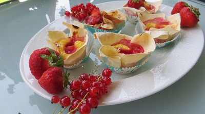 2. Backofen vorheizen (E-Herd 175°C; Unluft 150°C). Ein Muffinbackblech (mit 12 Mulden) fetten und jedes Teigblatt (ich habe Yufkateig genommen) in 4 gleich große Quadrate schneiden. Muffinmulden mit jeweils 2 Quadraten auslegen. Ca. 3 EL Frischkäsecreme darin verteilen. Je ca. 1 TL Fruchtauftrich (ich habe Johannisbeer-Gelee genomen), auf die Frischkäsecreme geben und leicht unterrühren.