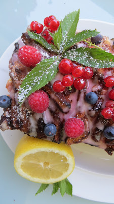 4. Johannisbeeren waschen, abtropfen lassen, mit einer Gabel von den Rispen streifen. Puderzucker mit 1-2 EL Wasser (ich habe Zitronensaft genommen) glatt rühren. Guss und Beeren auf dem Kuchen verteilen.