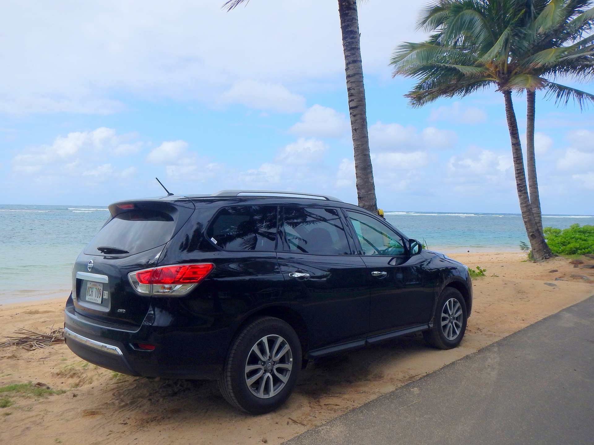 Besonderheiten: Limited Ausstattung. Nur 4zyl - hatte am Mauna Kea und im Waipio Valley ganz schön zu kämpfen. 9-Gang Automatik. Schaltet unter Last permanent hin und her, sonst sehr angenehm. Reine Straßenreifen. Recht neu und sauber. ca. 9l/100Km (musste aber viele Steigungen fahren, was den Schnitt schon stark drückte) Von dem hässlichen Frontdesign abgesehen ein guter Begleiter...