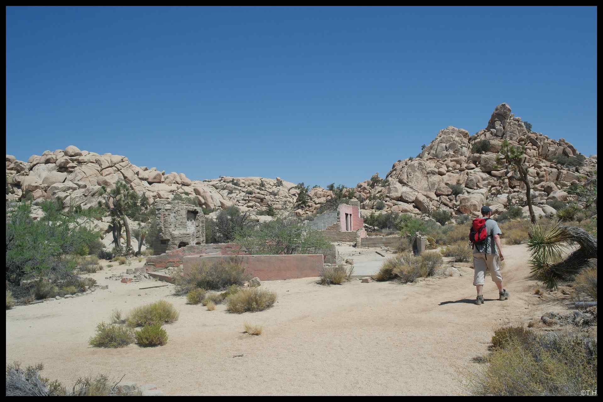 Im Joshua Tree angekommen weist uns der Ranger am Eingang darauf hin, Wasser mitzunehmen, es würde heute sehr heiß. Jo, haben wir dabei. Dann fahren wir bis zum Parkplatz am Barker Dam und laufen den Mills Trail. Der macht riesig Spaß. Wir sind mal wieder ganz alleine hier unterwegs und so lassen wir uns Zeit, genießen die Natur und freuen uns mal wieder wie Bolle hier zu sein. Wir fotografieren , staunen mal wieder über die Hinterlassenschaften und schlendern langsam wieder zurück.