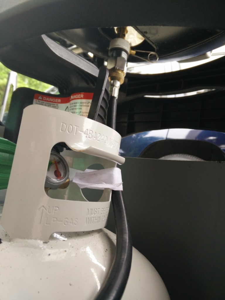 Gasflasche, Schlauch, Adapter, Kocher (von unten durchgeschoben, Weber Brenner ist nicht angeschlossen)
