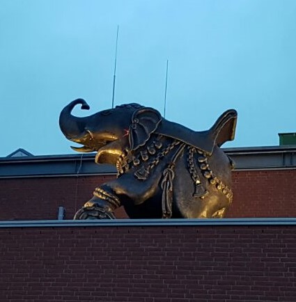 der Elefant steht auf dem Dach eines Nebengebäudes, in dem sich das T.NT befindet