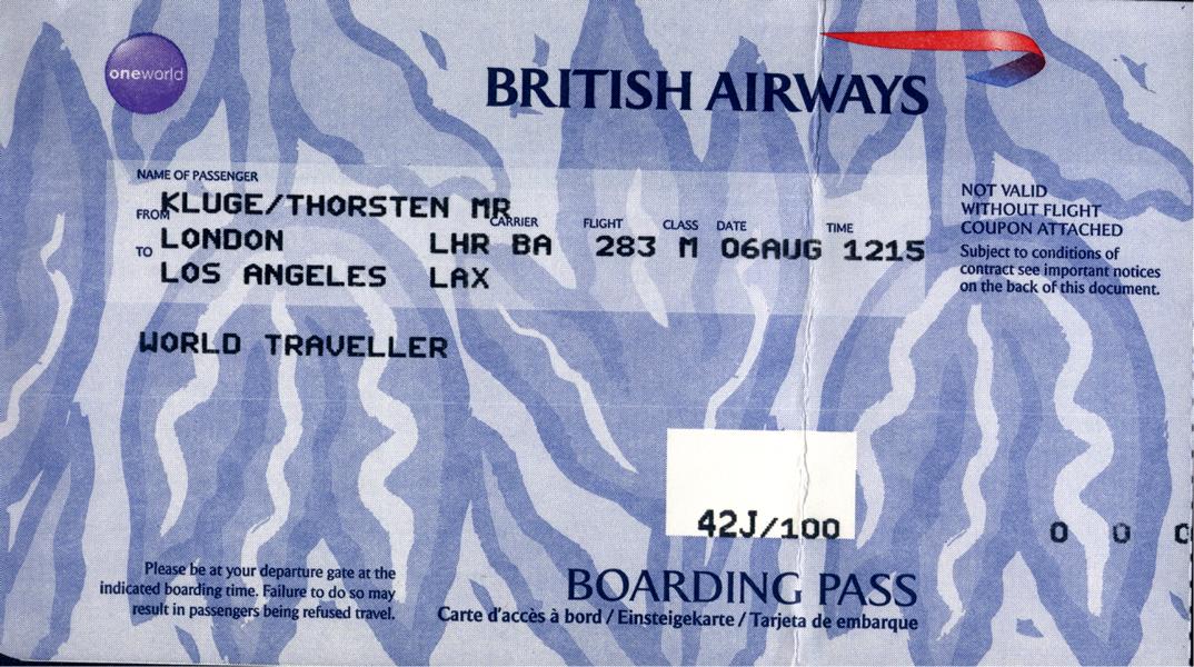 • 06.08.1999 von Berlin nach London mit anschließenden Weiterflug nach Los Angeles.