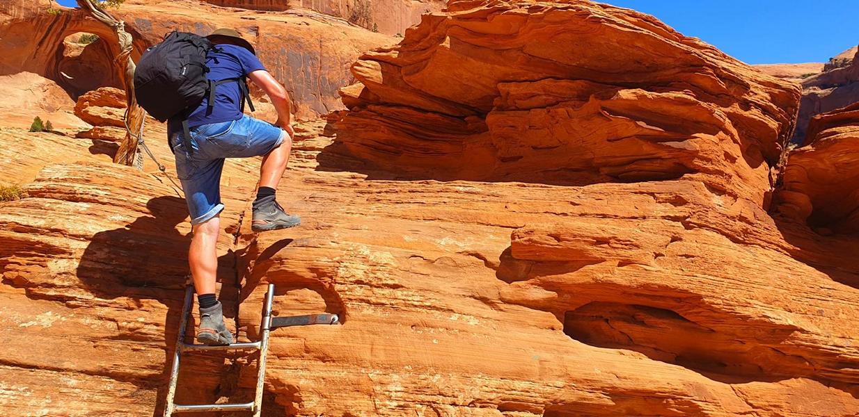 Ich wollte ja Christine die Chance geben zu rätseln und zu lösen. Da es nun aber nicht mehr weiter geht lös ich offiziell, dass es sich um den Aufstieg zum Corona Arch bzw. Little Rainbow Bridge handelt. Im Hintergrund des Bildes ist auch der Bowtie Arch zu sehen, der mich ziemlich schnell auf die Lösung gebracht hat.
